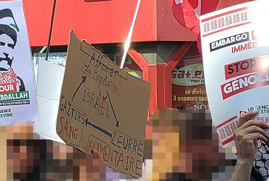 J’ai vu des gens sourire devant cette pancarte, et la prendre en photo, il semble, par plaisir. Cette pancarte appelle à la destruction de l’État d’Israël en niant sa « légitimité » à exister, c’est pas écrit tel quel mais nier ce sens est malhonnête, c’est évident.