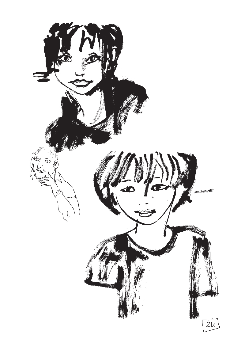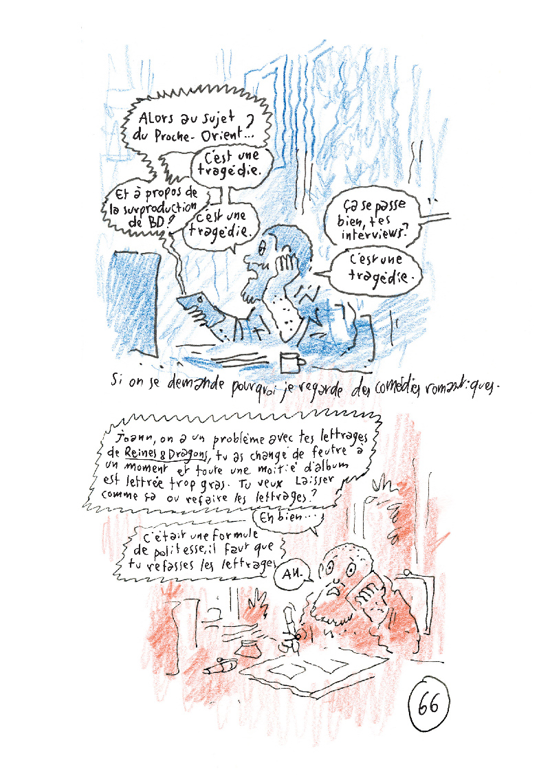 Dans ce carnet, il y a aussi ce besoin de dessiner le quotidien : les souris dans la maison et le chien qui ne s’en préoccupe pas, son petit dernier qui grandit, ses projets en cours et en retard. Besoin de juste retranscrire les choses qui l’entourent : les piétons qui attendent que le feu rouge passe au vert. De prendre le temps de reproduire le bar en zinc de certains bistrots, le croissant qu’il engloutit avant un rendez‐vous chez sa nutritionniste (il aimerait se délester d’un poids), Paris et sa poésie à la Sempé. Il recopie même les conversations de ses voisins de cafés (« Les pires baby sittings c’est mieux que mes beaux-parents »), un peu pour se moquer, un peu pour montrer une partie de la société, un peu pour nous tendre un miroir.