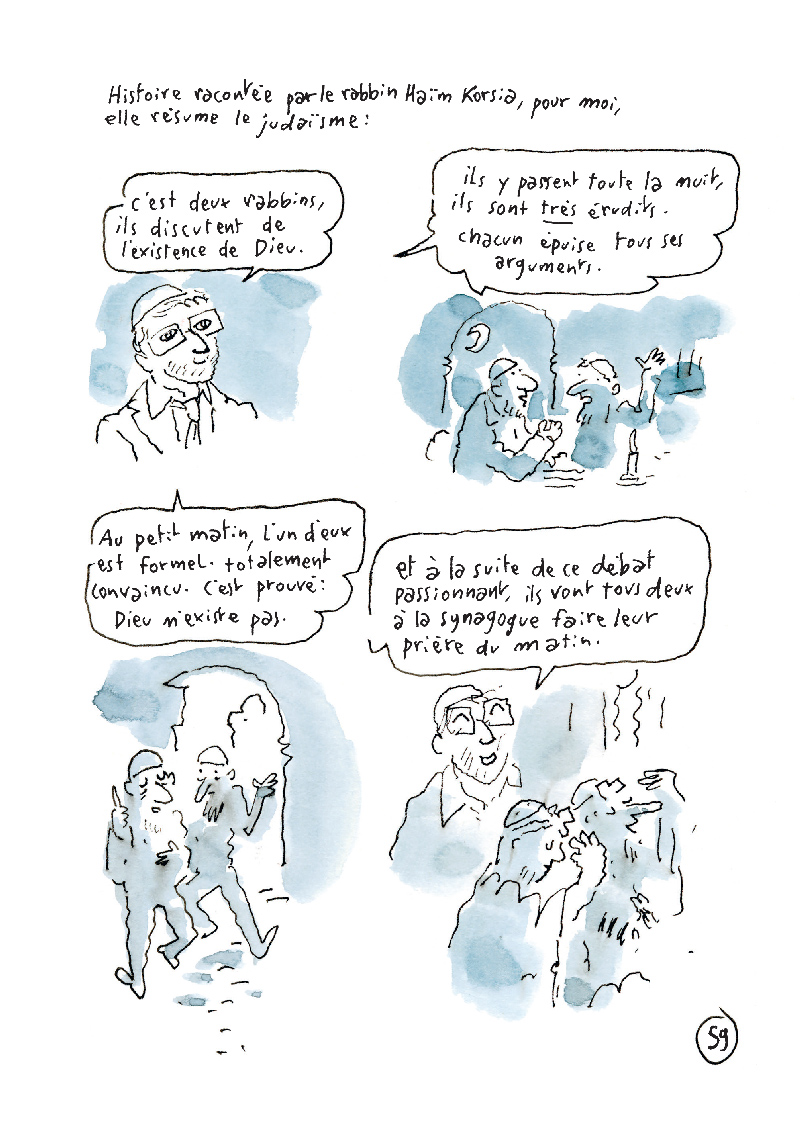 Comme Joann Sfar qui « tente de ne pas être ce personnage de juif anxieux » sur la plage, on tente de ne pas absorber ses angoisses. D’admirer le paysage, les corps hâlés et dénudés, et les couleurs d’été qui détalent sur la page. De faire diversion en s’attardant sur celles et ceux dont les névroses pèsent moins lourd. De zoomer sur les mimiques de Louise, sa femme, qui paraît vivre de désinvoltures et de jouissances. Mais, dans son récit, les morts juifs reviennent, ses proches et ses moins proches (au nombre de six millions). Sur l’île grecque de Zante, il apprend presque par hasard (et aussi, parce qu’il porte un Haï חי ce qui peut orienter les discussions) que, pendant la guerre, la population locale a protégé les Juifs en les cachant, en leur étant solidaire.