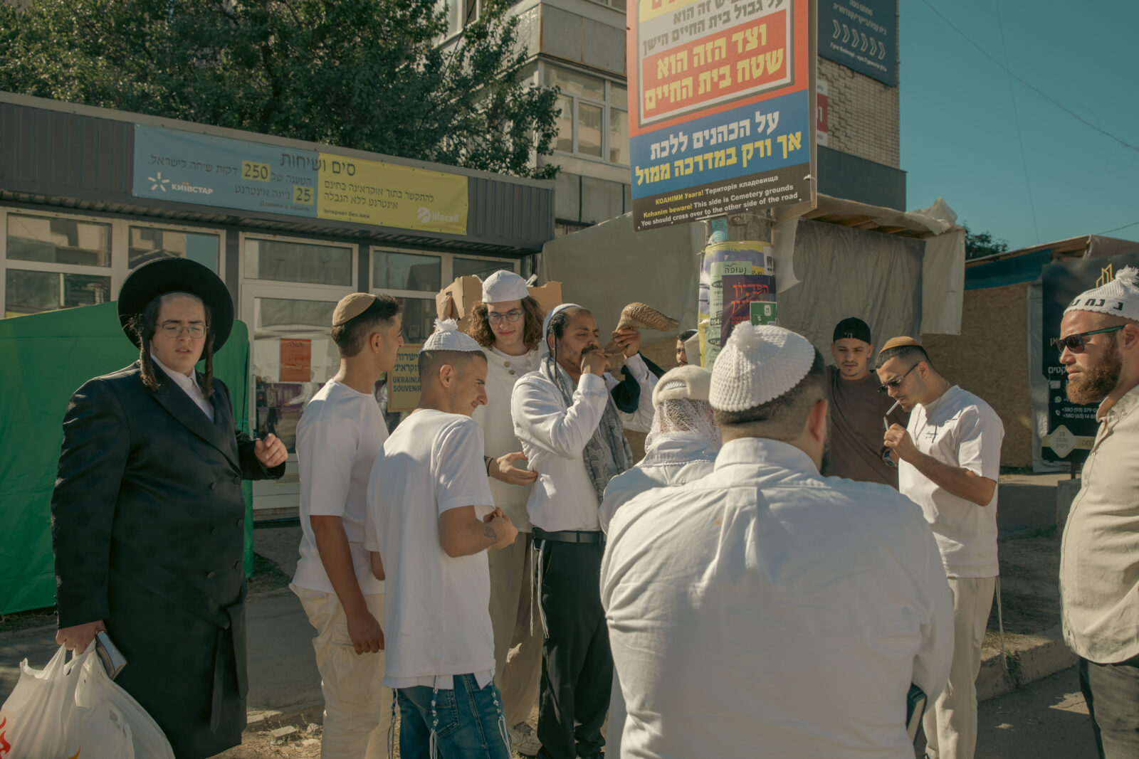 Les pèlerins français, eux, se montrent plus anxieux. Yossef, venu pour la première fois, raconte : « Ma mère pleurait quand je suis parti. Elle me disait : pourquoi y aller ? Il y a la guerre. » Recouvert de porte‐bonheurs achetés sur place, coiffé d’une kippa tricotée blanche typique des Bratslaver, il se fend d’une plaisanterie avant d’admettre : « Je ne vais pas mentir, j’avais un peu peur aussi. Mais ici, l’ambiance est magnifique, on sent l’amour d’HaShem. Depuis que je suis à Ouman, je me sens en sécurité. Cela dit, j’envoie un message à ma mère dès que je peux. »