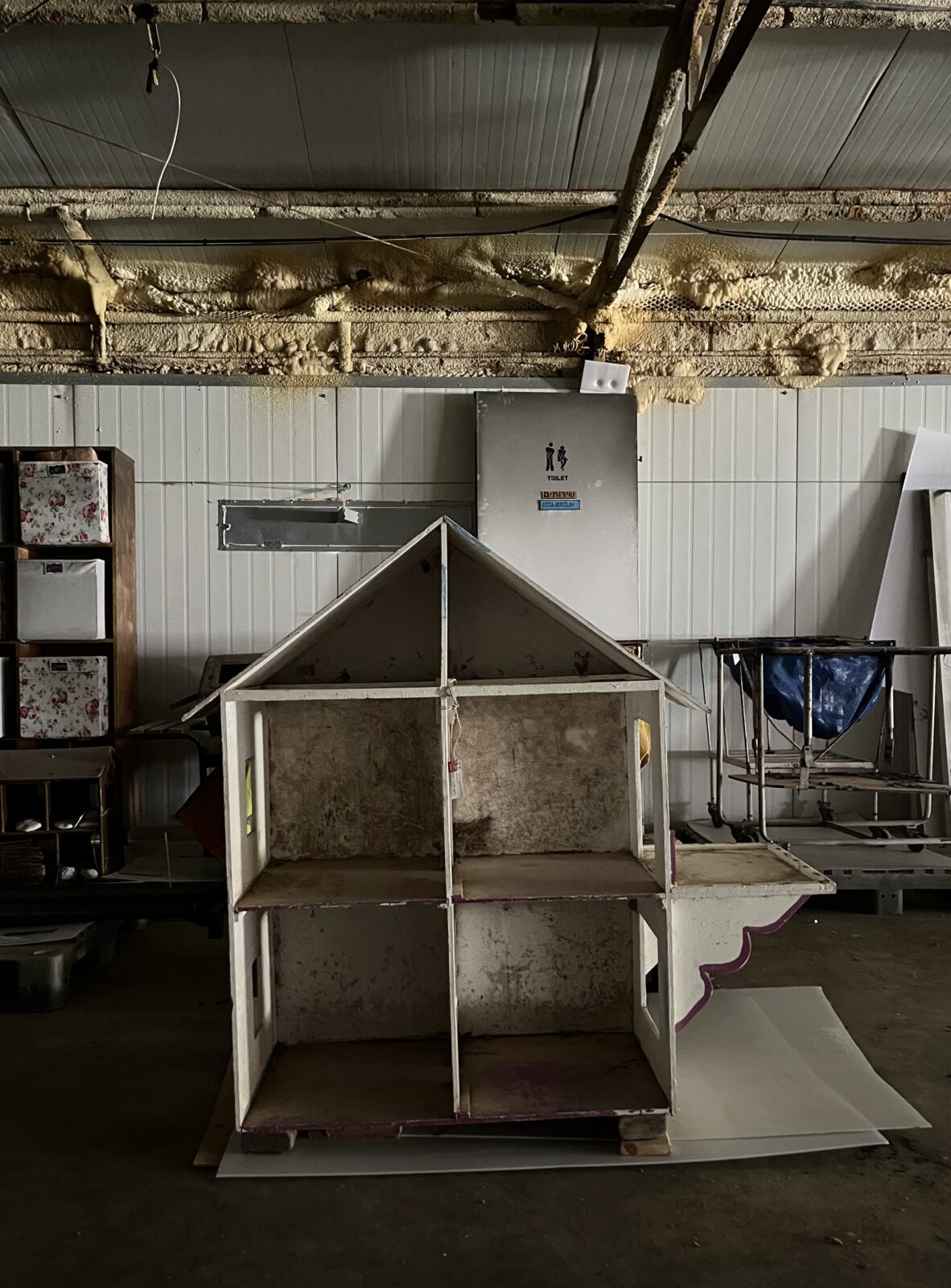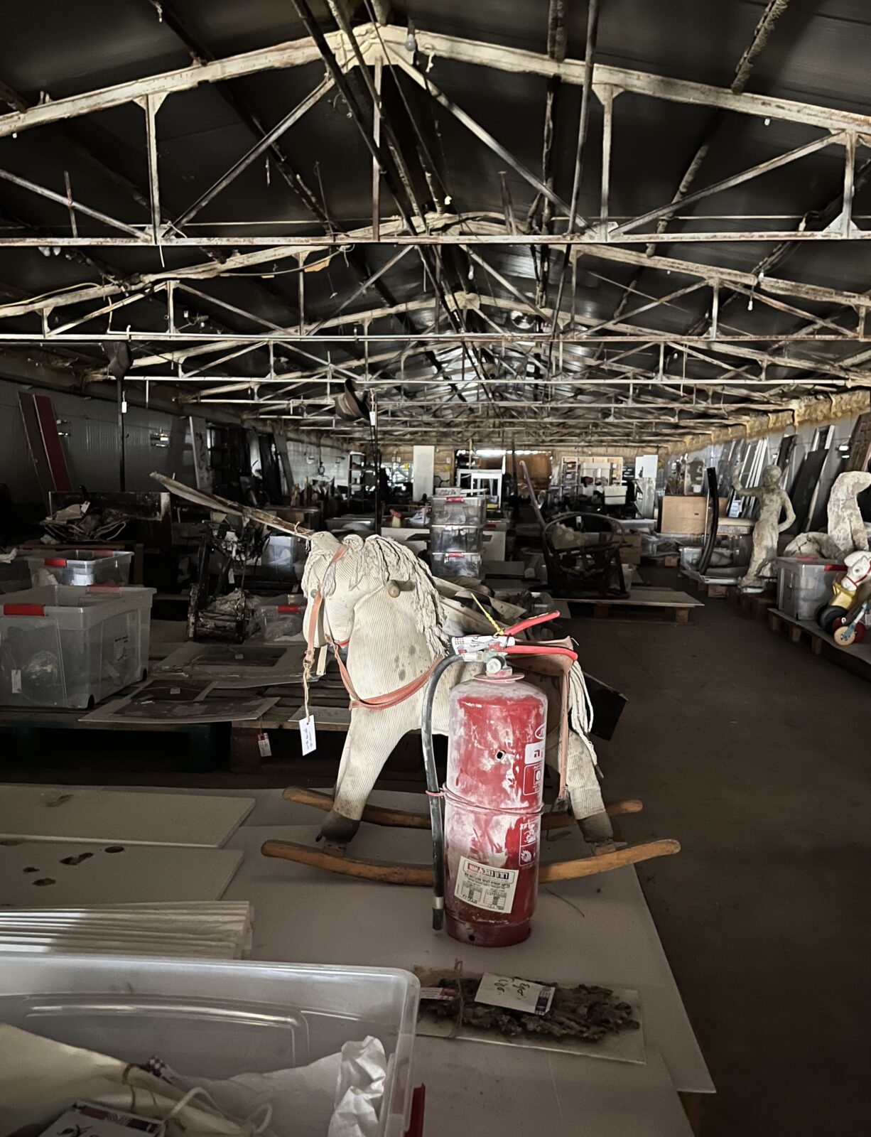 Lorsque Nirit me conduit dans la réserve principale de Nir Oz, l’émotion me saisit. Dans cet ancien hangar d’élevage de poules éclairé de néons, le sol est parsemé de palettes surélevées, socles d’une multitude d’objets hétéroclites. Une brocante de l’horreur, me dis‐je… Je suis d’abord surprise de voir la quantité de portes et de fenêtres entreposées le long des murs. Toutes sont criblées d’impacts de balles, les verres brisés, le revêtement plastique et la serrurerie fondu et déformé, le bois carbonisé. Certaines gardent encore la trace d’une chambre d’enfants, vitres aux joyeux stickers colorés portant les traces d’une fusillade. D’autres sont des portes blindées de chambres fortes, et l’acharnement dont elles gardent les traces est terrifiant. Au centre du hangar, sur des cartons neutres de conservation, méticuleusement étiquetés et référencés, des appareils électroménagers, du mobilier d’intérieur, des outils agricoles : un lave‐vaisselle encore rempli des verres fondus du Shabbat, des lampadaires déformés aux ampoules éclatées, un ventilateur métallique informe, la carcasse d’une voiturette agricole, des sculptures décoratives et des objets religieux couverts de suie, des bibliothèques noircies encore chargées de leur contenu, beaucoup de jouets d’enfants, et puis un four… Parmi cette longue liste, je retiendrai cet extincteur calciné, avoisinant un cheval à bascule, comme l’image d’un triste vétéran rescapé des flammes qui n’aurait pas accompli sa mission à temps. Je n’oublie pas non plus cette maison de poupée en bois, jouet miraculé du jardin d’enfants de Nir Oz qui, bien que vidée de son contenu et des rêves innocents qu’elle abritait, est restée presque intacte.