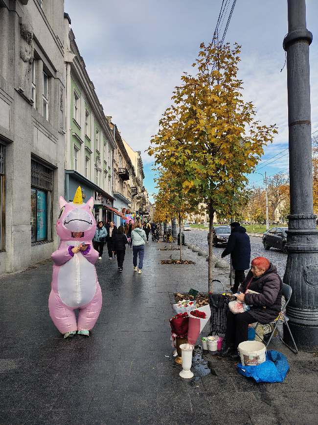 Je sors marcher dans les rues pavées de Lviv. Les vitrines débordent de couleurs. Une vieille femme vend des fleurs à côté d’un jeune homme déguisé en licorne rose – image absurde et bouleversante d’un pays qui continue de vivre, coûte que coûte.