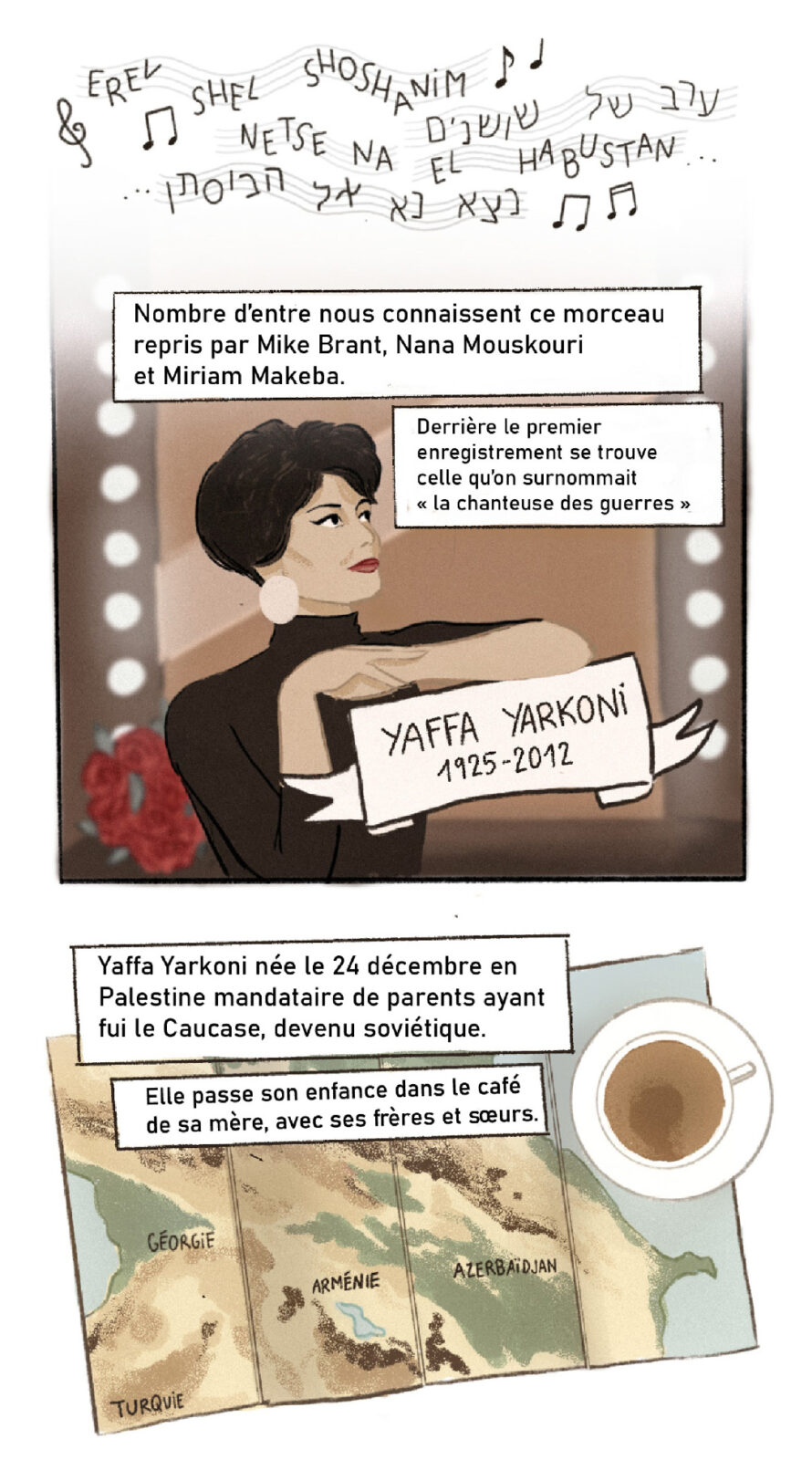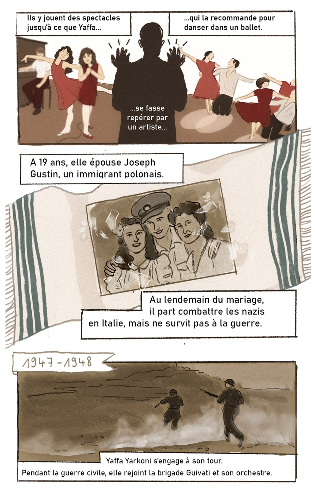 Episode 1 de la série « Divas d’Or » sur Yaffa Yarkoni, à l’occasion du centenaire de cette chanteuse, qui avait commencé sa carrière en soutenant l’armée israélienne avant de devenir persona non grata pour son positionnement pro‐palestinien. « Divas d’Or » met en lumière des icônes juives des régions de Méditerranée, du Moyen‐Orient et du Sud‐Caucase, à travers une série en bande dessinée, mêlant musique, histoire et géopolitique à travers leurs destins du XXᵉ siècle à aujourd’hui.