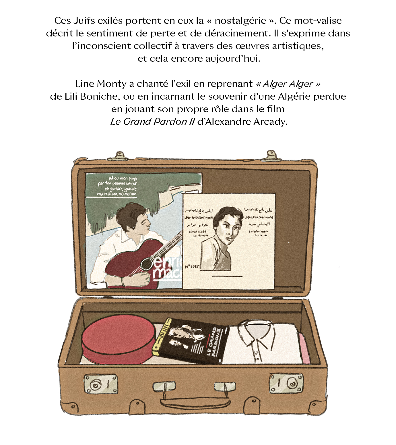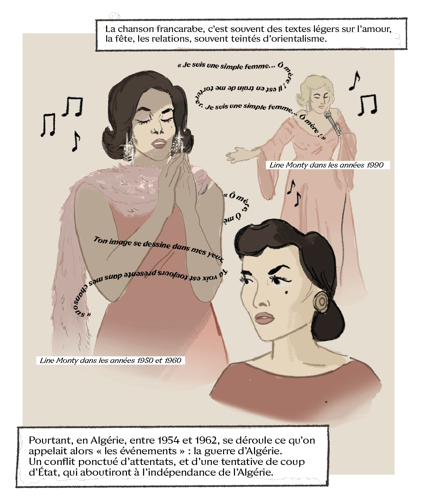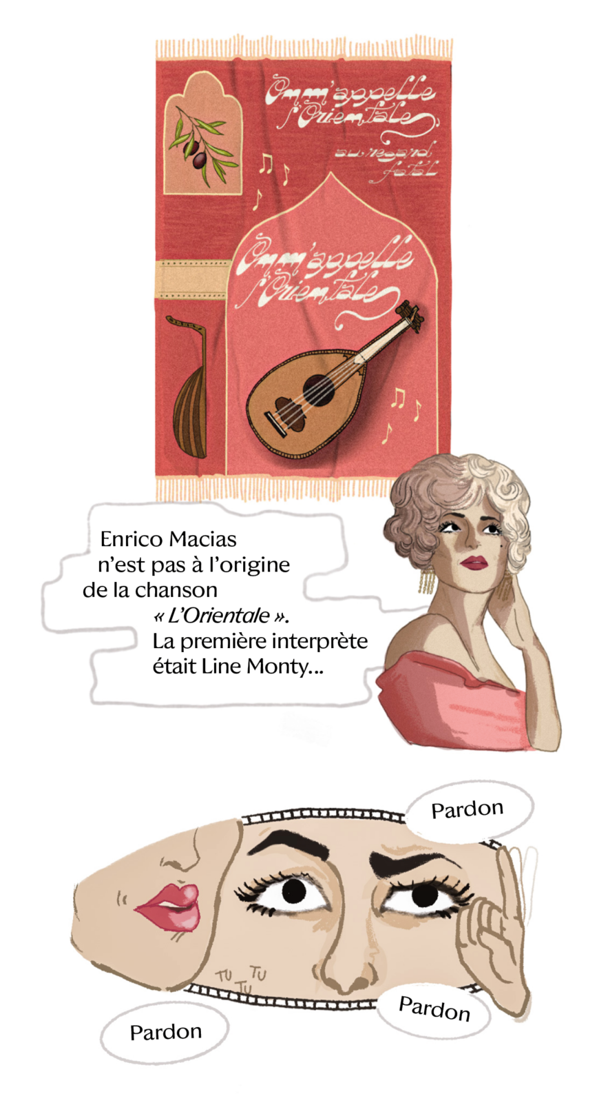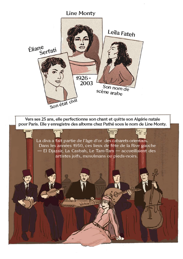Avec “Divas d’Or”, Camille Scali met en lumière des icônes juives des régions de Méditerranée, du Moyen‐Orient et du Sud‐Caucase, à travers une série en bande dessinée, mêlant musique, histoire et géopolitique. Dans ce deuxième épisode, place à Line Monty, icône des cabarets orientaux à Paris dans les années 1950 et grande figure qui incarne l’exil des Juifs d’Algérie.