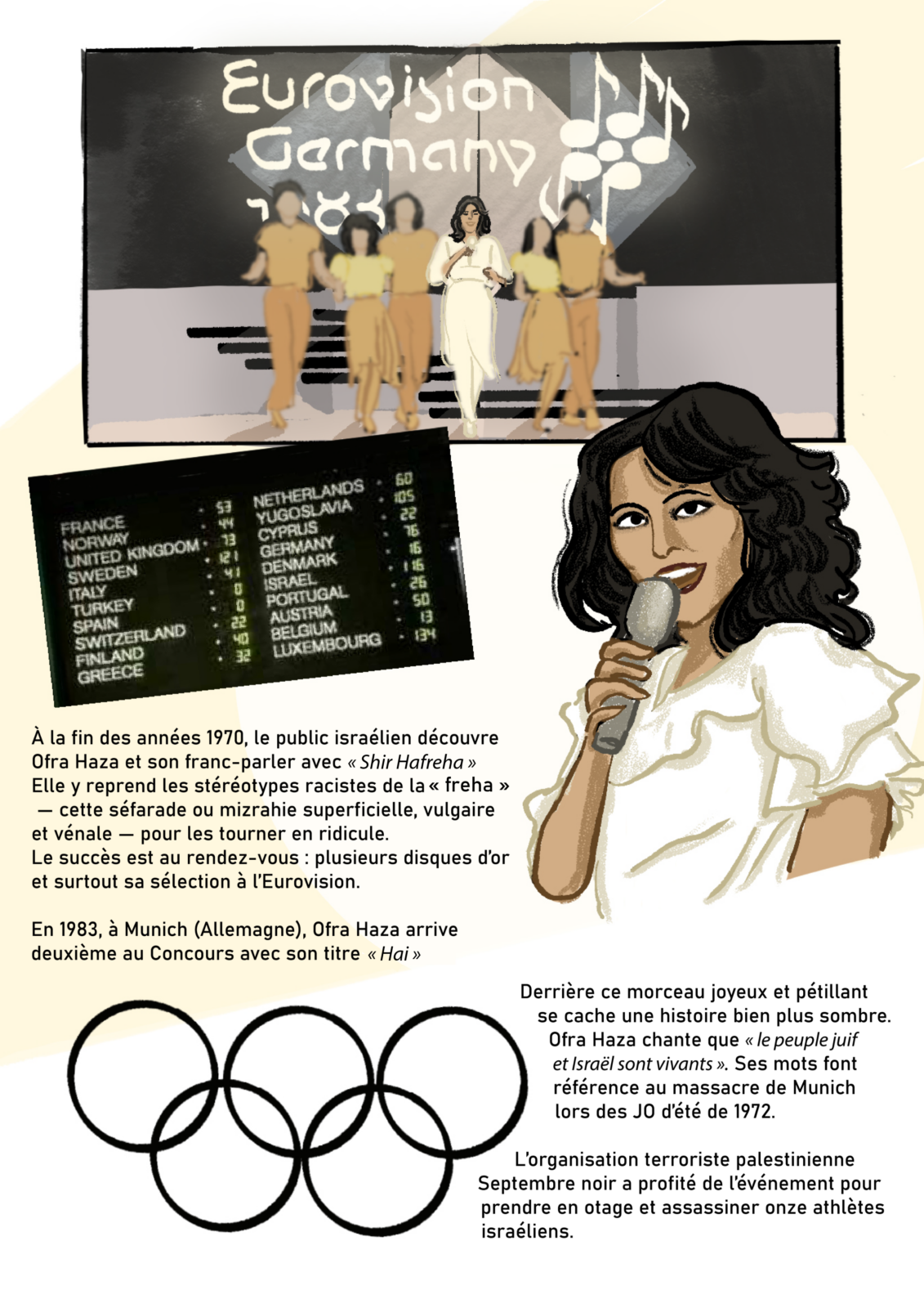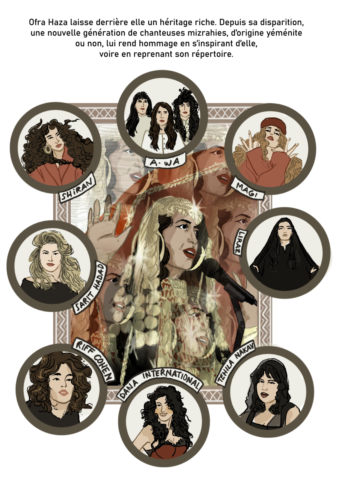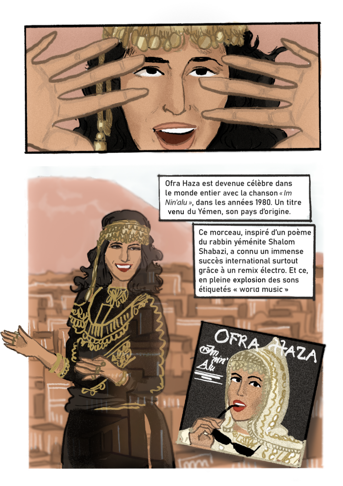 Avec “Divas d’Or”, Camille Scali met en lumière des icônes juives des régions de Méditerranée, du Moyen‐Orient et du Sud‐Caucase, à travers une série en bande dessinée, mêlant musique, histoire et géopolitique. Ce troisième épisode rend hommage à Ofra Haza, chanteuse yéménite que l’on surnommait « La Madonna israélienne ».
