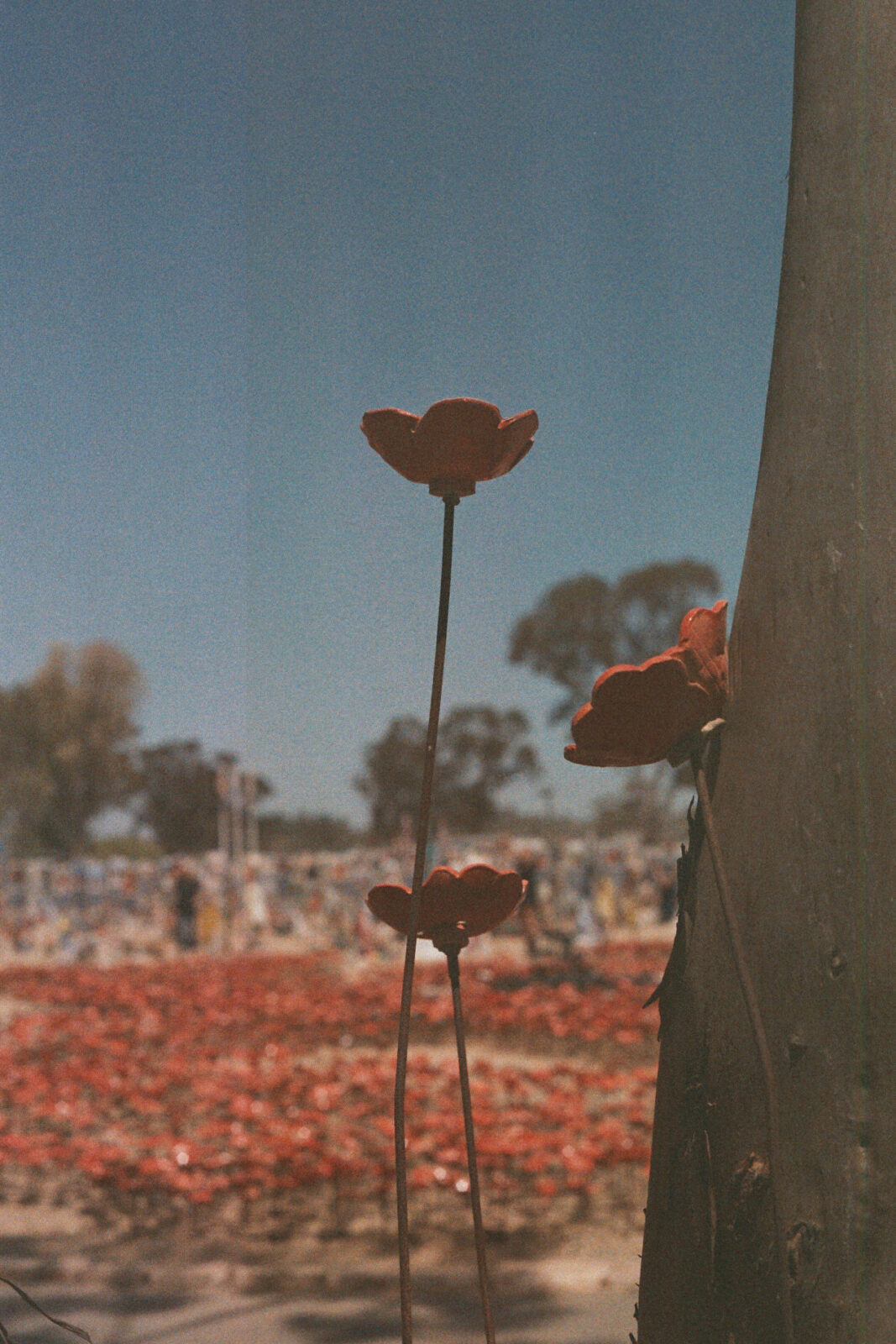 Le choix s’est porté sur ces anémones, comme un déplacement nécessaire. Des centaines d’artistes et de bénévoles venus de tout le pays ont rejoint ce projet itinérant, initié par l’artiste Yaffa Solomon. Les anémones symbolisent le deuil profond des jeunes vies, fragiles comme des fleurs, arrachées trop tôt, mais aussi l’espoir d’une floraison renouvelée. Elles me permettent de parler de la mémoire, de la perte et de la persistance sans exposer directement les visages, et de laisser au regard un espace de respiration. Dans le Sud d’Israël, les anémones (kalaniyot) font partie du paysage. Elles apparaissent après la pluie et portent déjà une charge symbolique forte. C’est dans ce temps d’attente, de présence prolongée sur le lieu, que j’ai vu un père venir nettoyer quotidiennement le portrait de sa fille assassinée. Un geste simple, répété, qui m’a brisé le cœur.