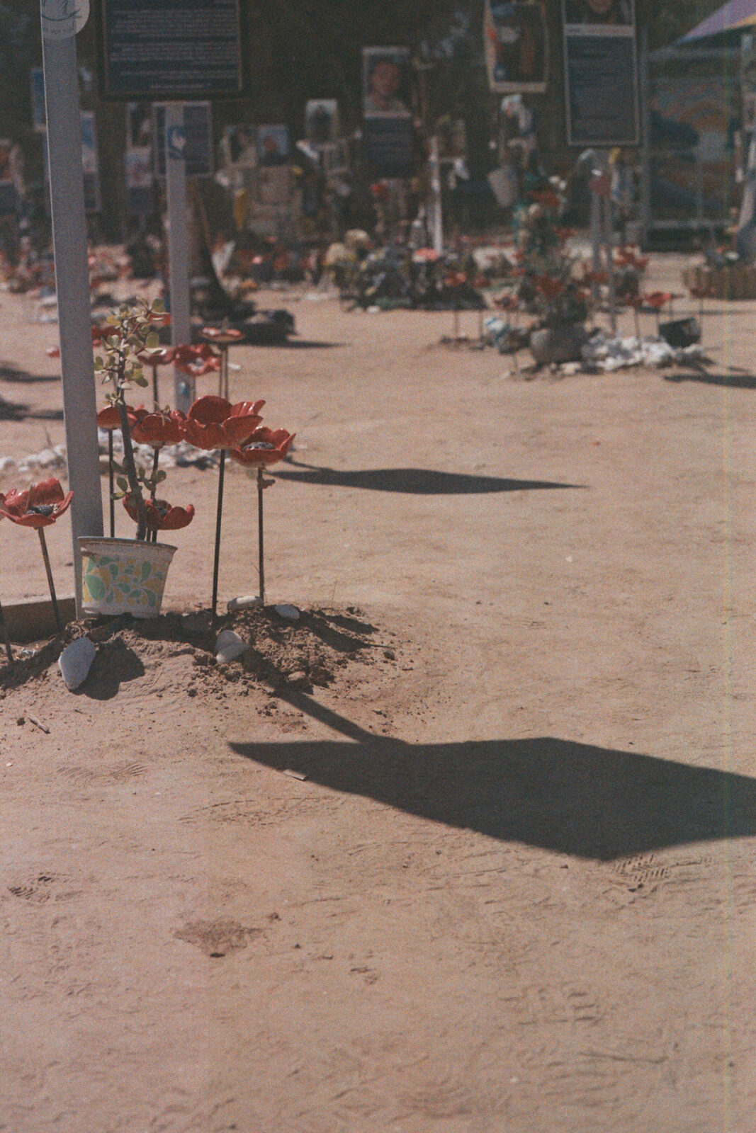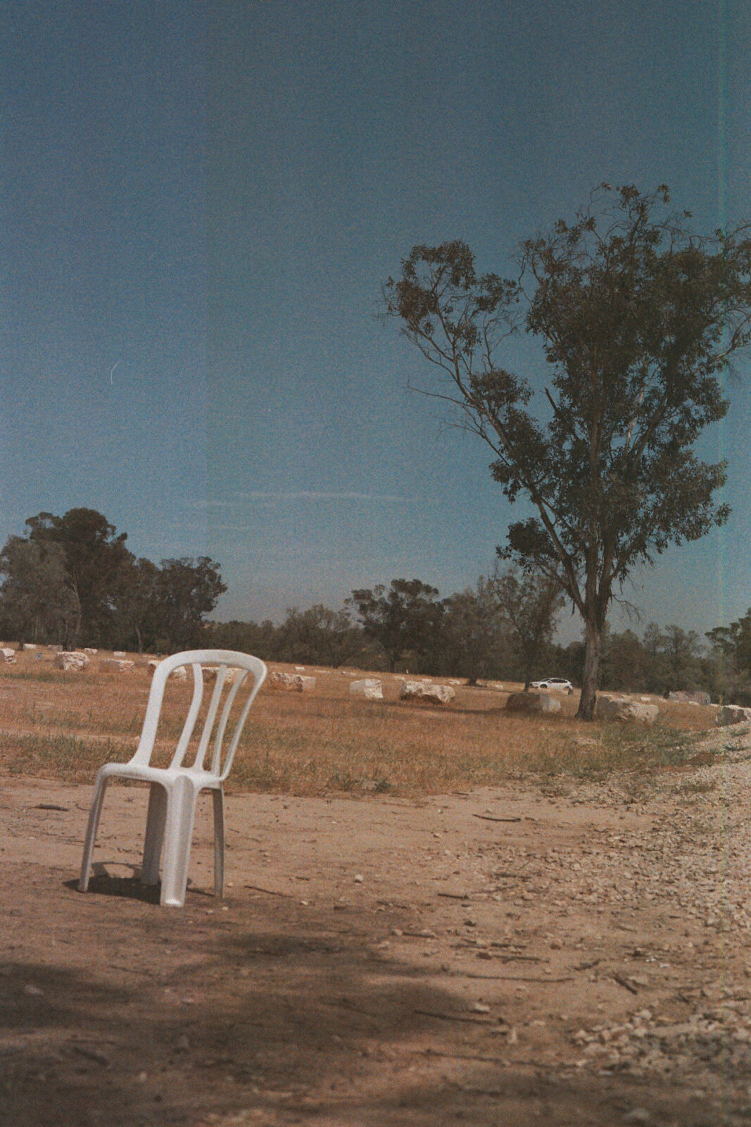 Avant d’arriver sur ce site de recueillement, nous avons visité le cimetière des voitures calcinées. Des carcasses alignées, figées, silencieuses. Ce lieu m’a profondément choquée. Il donnait une matérialité brute à la violence, avant même toute image humaine. Quand je suis arrivée ensuite sur le lieu que j’ai photographié, ce que je portais était déjà très lourd. Sur place, ce qui m’a particulièrement marquée, c’est le décalage violent entre le silence du lieu de recueillement et le bruit des bombes que l’on entendait au loin, à Gaza. Ce contraste était frappant. On se tient dans un espace dédié au souvenir, entouré de terre, d’arbres … et en même temps la guerre continue, audible, impossible à ignorer. Je n’ai pas souhaité intégrer de visages dans cette série. Il y en avait déjà partout, ils étaient omniprésents, sur les affiches, dans l’espace public, dans les regards. J’avais besoin de me tenir ailleurs.