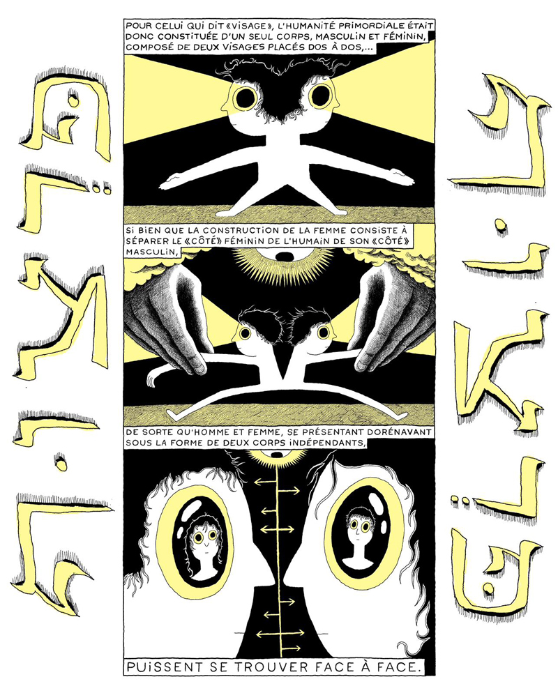 Pour celui qui dit « visage », l’humanité primordiale était donc constituée d’un seul corps, masculin et féminin, composé de deux visages placés dos à dos, si bien que la construction de la femme consiste apparemment à séparer le « côté » féminin de l’humain de son « côté » masculin, de sorte qu’homme et femme, se présentant dorénavant sous la forme de deux corps indépendants, puissent se trouver face à face.