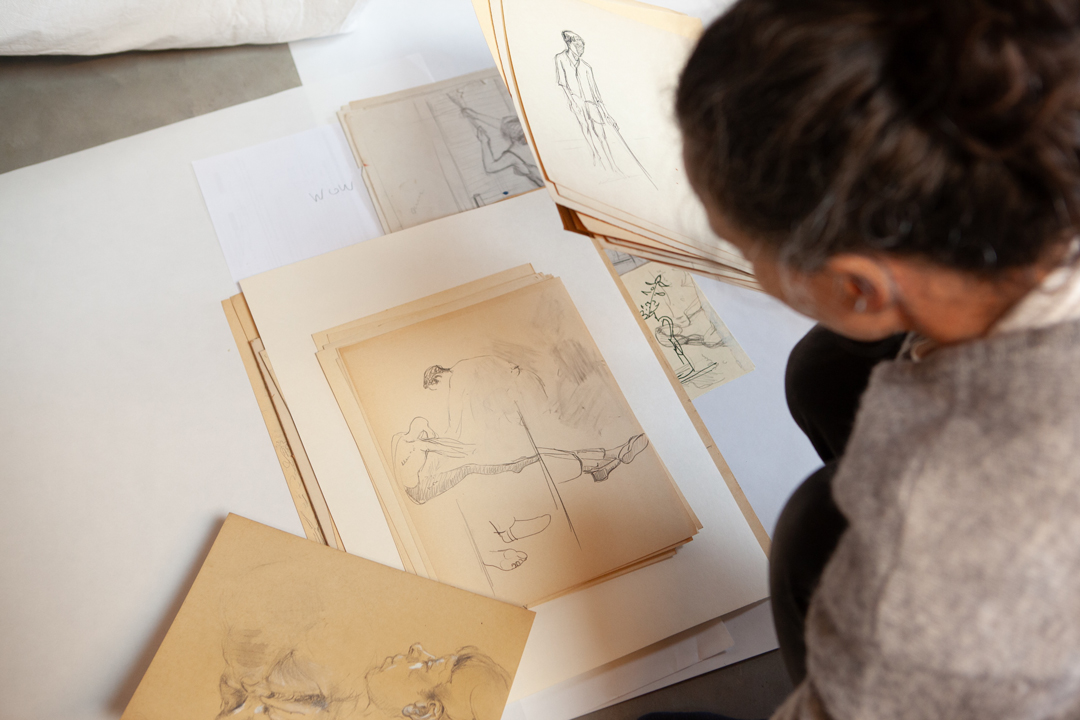 Comment alors découvre‐t‐elle l’histoire des œuvres spoliées de Diane ? En 2021, une historienne autrichienne, qui rédige une thèse sur les femmes artistes dont le travail avait été spolié et emmené en Allemagne, la contacte. Puis, c’est au tour de l’historienne Sophie Julliard qui étudie le pillage des ateliers d’artistes sous l’Occupation, qui lui confirme que sa grand‐mère a bien été spoliée. "Je découvre d'un coup qu'il y a eu quelque chose d'important dans la vie de ma grand-mère, que son travail a été anéanti presque intégralement". En tant qu’artiste, cela résonne d’autant plus en elle. "Que se passerait-il si, après treize ans de production, toutes mes œuvres étaient détruites ?" Ses questions ne s’arrêtent pas là. Adrianna Wallis ne peut plus faire sans cette histoire. Au début, elle n’ose pas creuser, comme si elle souhaitait garder ses distances avec la révélation, avec la spoliation. Et, en même temps, ses œuvres et notamment ses premières œuvres aux Beaux‐Arts traduisent ce non‐dit, se relisent autrement depuis qu’un voile s’est levé.