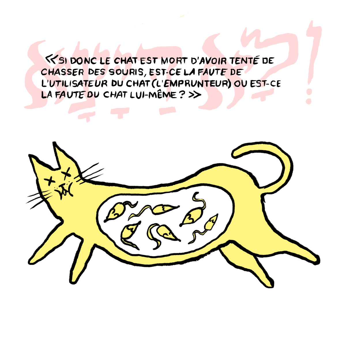 L’humour redoutable de ce passage a égaré bien des commentateurs. Il suffit pourtant d’en identifier la rigoureuse construction pour dégager le sens et l’enjeu de l’enseignement : le chat, en vertu de son instinct prédateur, est le dominant eu égard aux souris, mais il peut arriver, extraordinairement, que ses proies, parce qu’elles se sont unies contre lui, soient parvenues à renverser le cours des choses. Si donc le chat est mort d’avoir tenté de chasser des souris, est‐ce la faute de l’utilisateur du chat (l’emprunteur) ou est‐ce la faute du chat lui‐même ? La réponse est donnée par un enseignement de Rava au sujet de femmes qui sont parvenues à renverser le cours des choses en mettant hors d’état de nuire leur prédateur, sorte de mâle alpha : il n’y a dans ce cas « ni jugement, ni juge », c’est-à-dire qu’il n’y a pas lieu de juger la chose puisque, précisément, justice a été rendue. C’est donc que l’instinct prédateur du chat n’est pas une excuse valable : si les souris l’ont tué, c’est par sa faute, non par la faute de l’homme qui l’a emprunté afin qu’il chasse les souris. Autrement dit, les souris ont rendu justice à l’instinct prédateur du chat.
