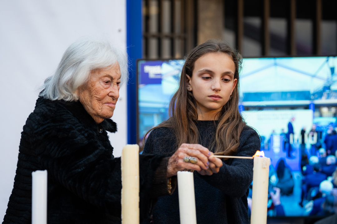 19h25. Le discours terminé, des rescapés accompagnés d’enfants du Talmud‐Tora de Judaïsme En Mouvement (JEM) allument les six bougies du souvenir.