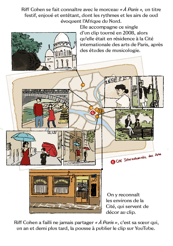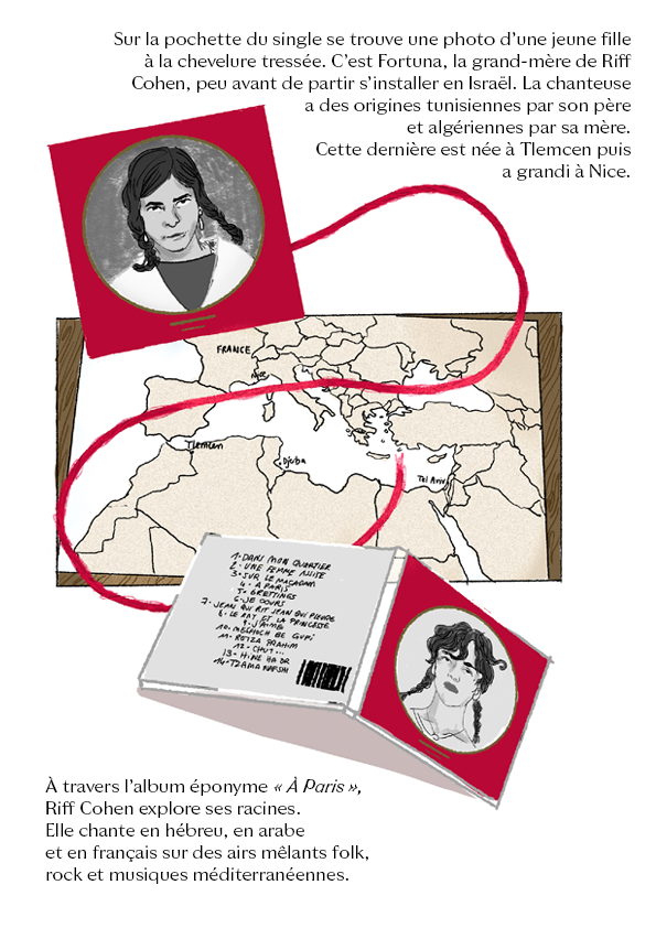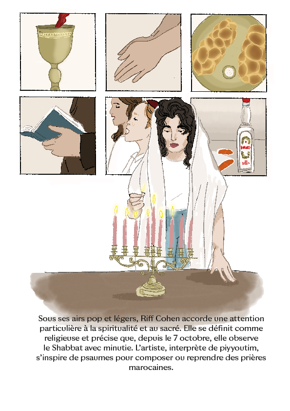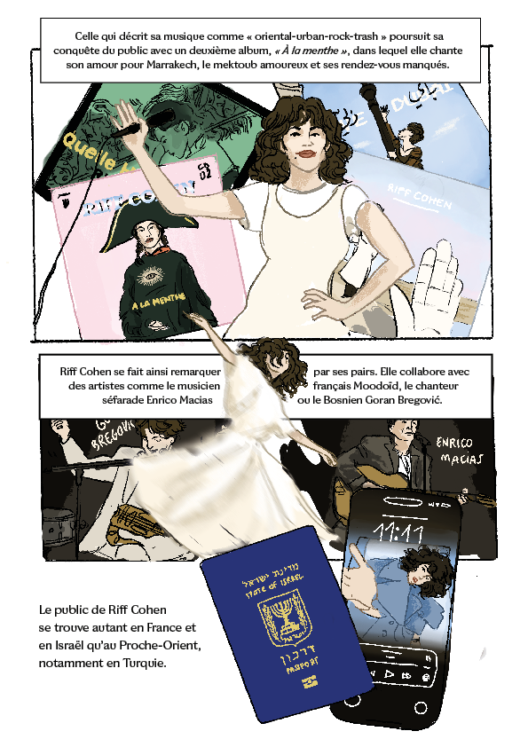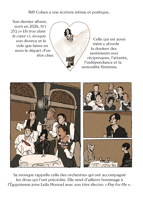 Avec “Divas d’Or”, Camille Scali met en lumière des icônes juives des régions de Méditerranée, du Moyen‐Orient et du Sud‐Caucase, à travers une série en bande dessinée mêlant musique, histoire et géopolitique. Pour clôturer cette série, ce dernier épisode dresse le portrait de Riff Cohen : artiste contemporaine aux influences musicales multiples, entre la pop et la musique de ses racines algériennes et tunisiennes.